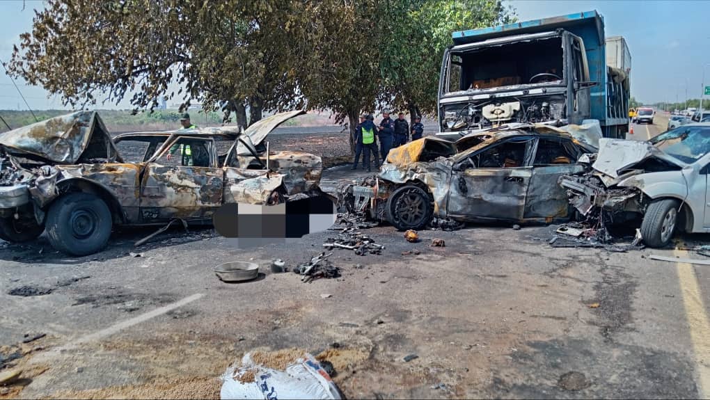 ***Un fatal accidente múltiple se registró este martes en la autopista Puerto Ordaz – Ciudad Bolívar, a la altura de Sidor, luego de que un incendio de vegetación anulara la visibilidad en la vía. El siniestro involucró a 11 vehículos, resultando en una persona calcinada y 15 lesionados***